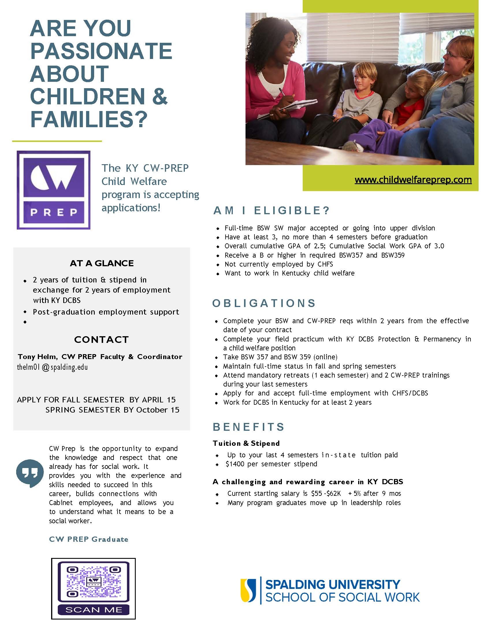 Do you have a desire to work with children and families? The KY CW-PREP Child Welfare Program at Spaulding University - School of Social Work is accepting applications to enroll in the CW PREP program. See flyer for additional information.