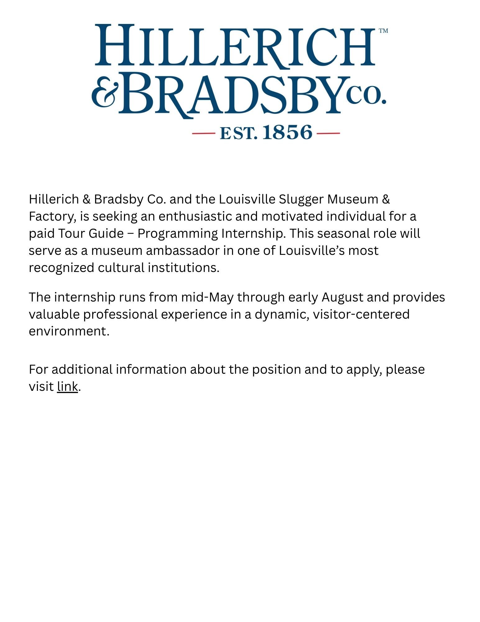 Hillerich & Bradsby Co. and the Louisville Slugger Museum & Factory, is seeking an enthusiastic and motivated individual for a paid Tour Guide – Programming Internship. This seasonal role will serve as a museum ambassador in one of Louisville’s most recognized cultural institutions.