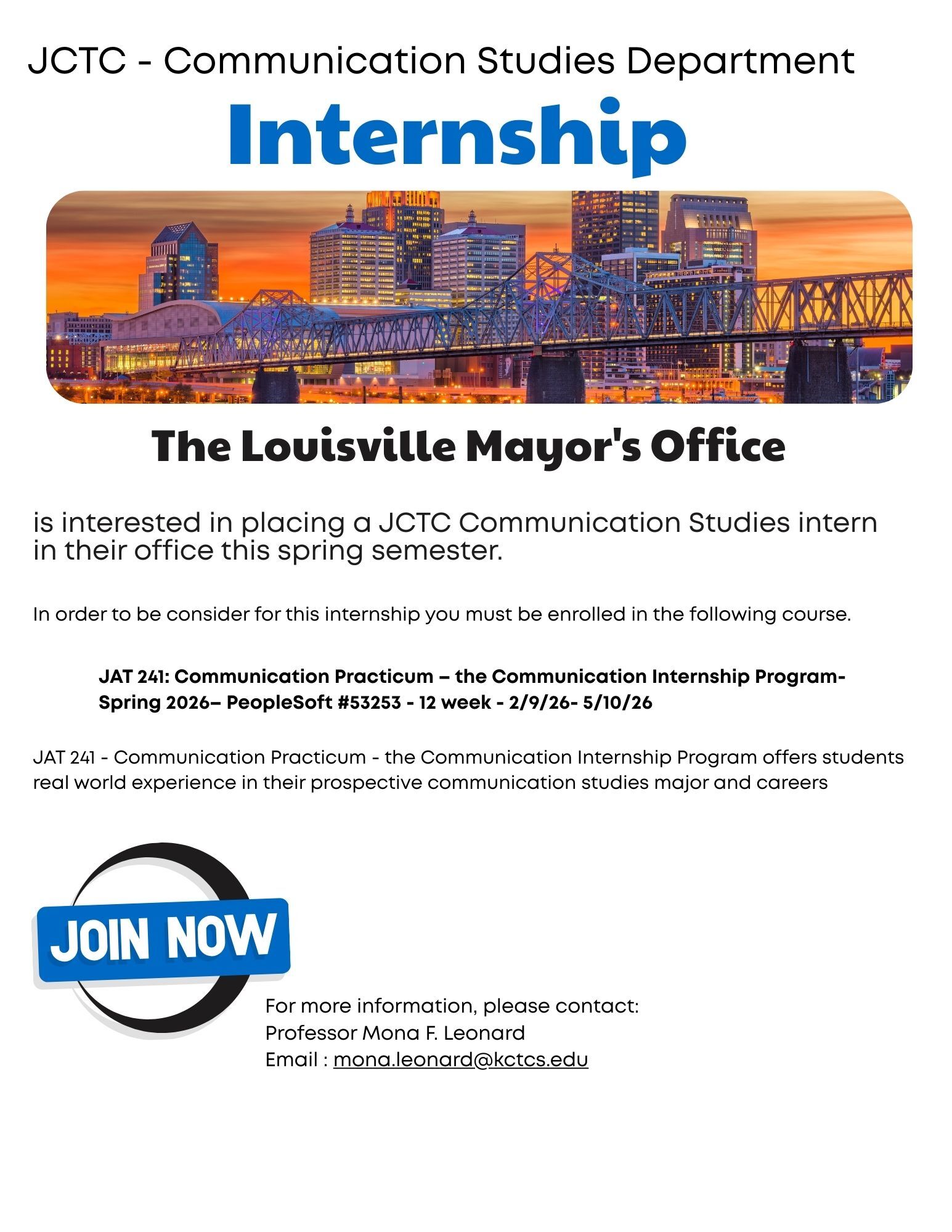 The Louisville Mayor's Office is interested in placing a JCTC Communication Studies intern in their office this spring semester. In order to be consider for this internship you must be enrolled in the following course: JAT 241: Communication Practicum – the Communication Internship Program- Spring 2026– PeopleSoft #53253 - 12 week - 2/9/26- 5/10/26. For additional information, contract Professor Mona Leonard at mona.leonard@kctcs.edu.