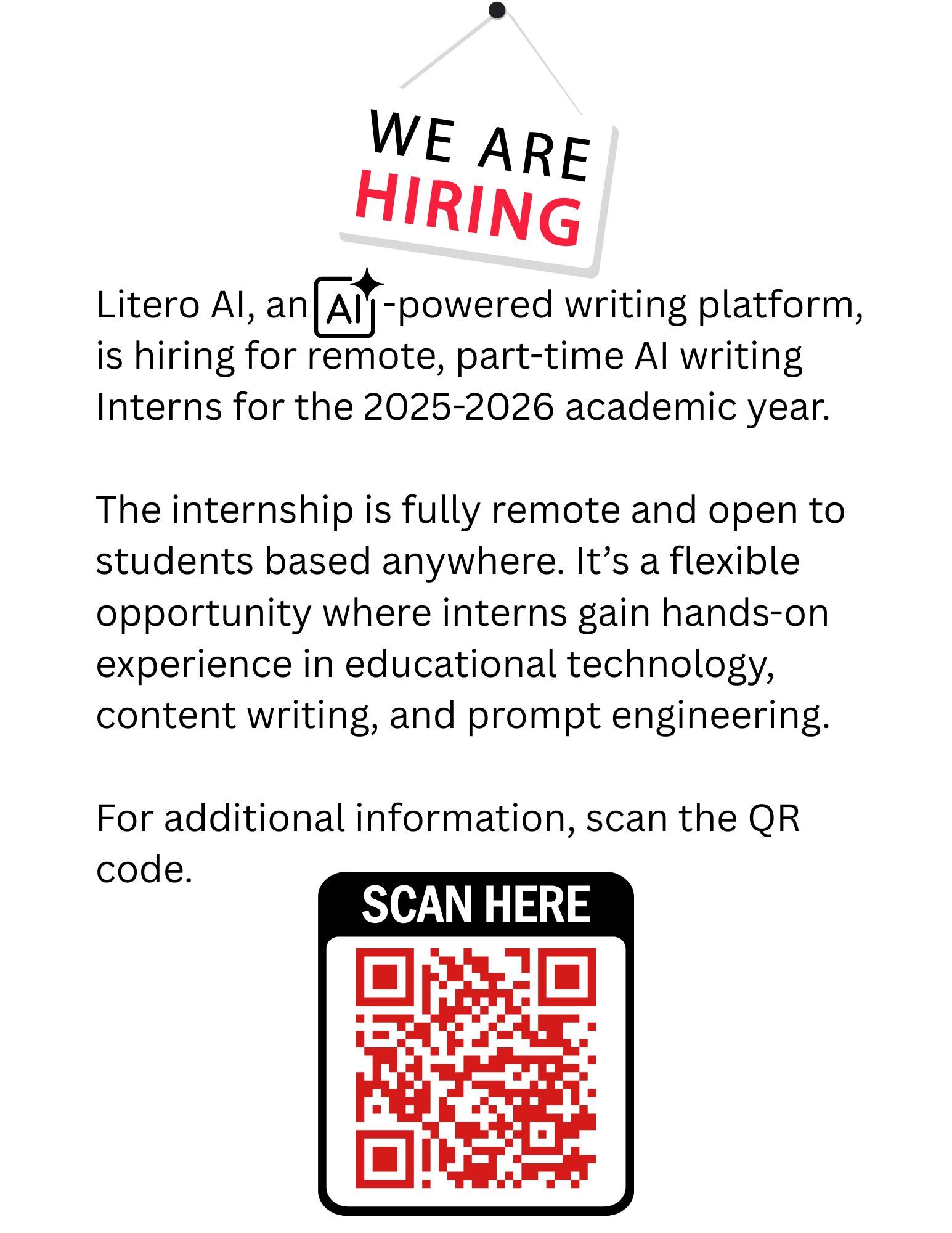 Litero AI, an AI-powered writing platform headquartered in the US and UK, are currently hiring remote, part-time AI Writing Interns for the 2025–2026 academic year. The internship is fully remote and open to students based anywhere. It’s a flexible opportunity where interns gain hands-on experience in educational technology, content writing, and prompt engineering. See the flyer for additional information and to apply for the internship. The application deadline is May 2026, Litero AI is running an ongoing recruitment cycle throughout the school year.